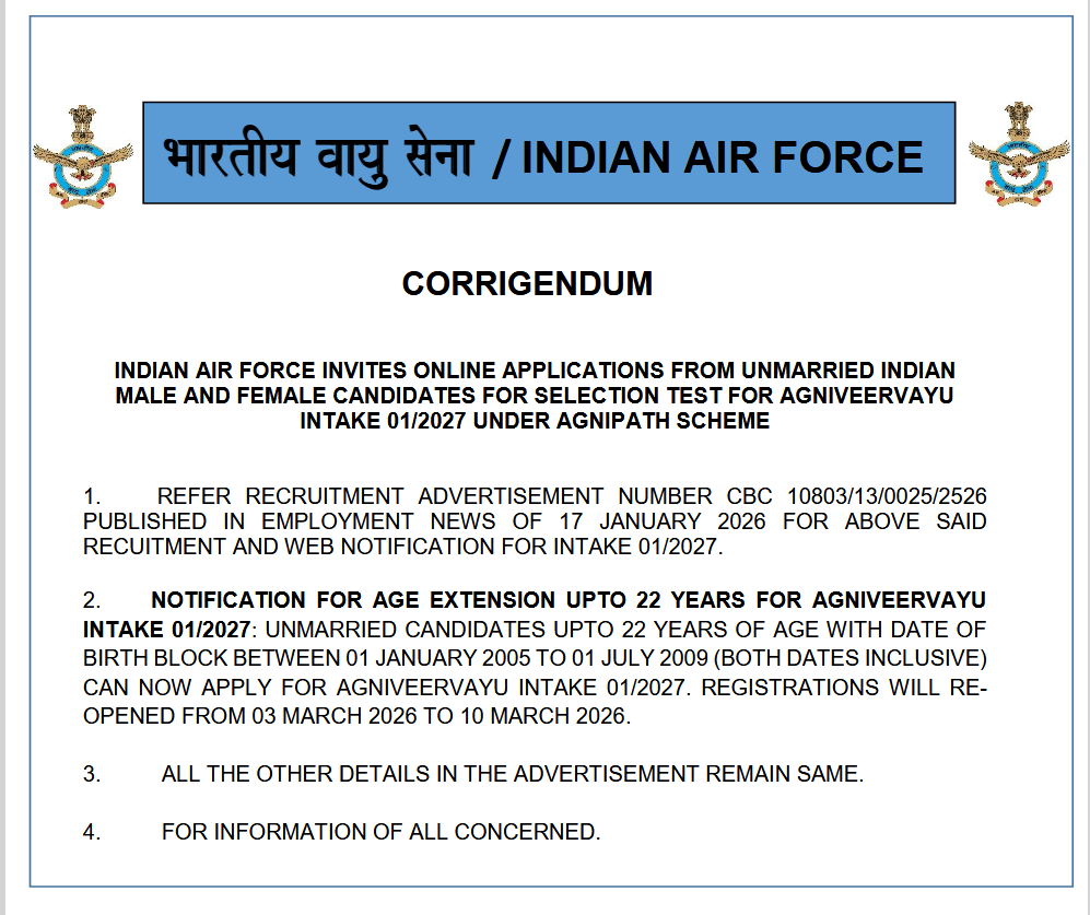 Indian Air Force (Join Indian Air Force) has released the Re-Open Form Notice on its official website for the Agniveer Vayu Intake 01/2027 Examination 2026. The online application process will begin on 03 March 2026 and candidates can apply until 10 March 2026. The minimum age limit for this recruitment is 17.5 years, and the maximum age limit is 22 years. Applicants are advised to carefully read the complete details, including eligibility criteria, important dates, and other necessary instructions, before submitting the online application form. (Advertisement No.: 01/2027)